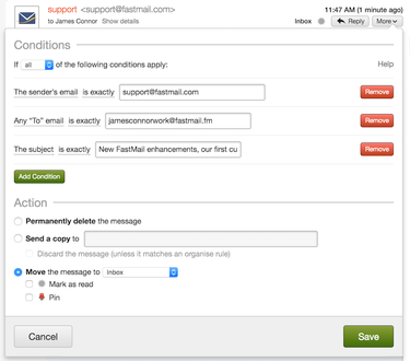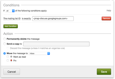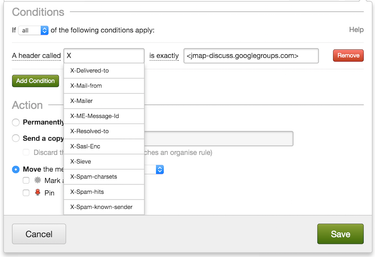 If the message is from a sanely setup mailing list the rule will be pre-populated with the mailing list id as a single condition, otherwise it uses a combination of the ‘To’, ‘From’ and ‘Subject’ headers. Note that in those cases where a large number of recipients were specified, it will limit the number of ‘To’ rules to 5.