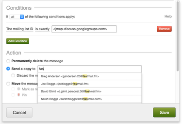 We have added context-aware auto-completion on many of the rule conditions and the ‘Send a Copy’ action whenever a rule is created or edited, as illustrated below: