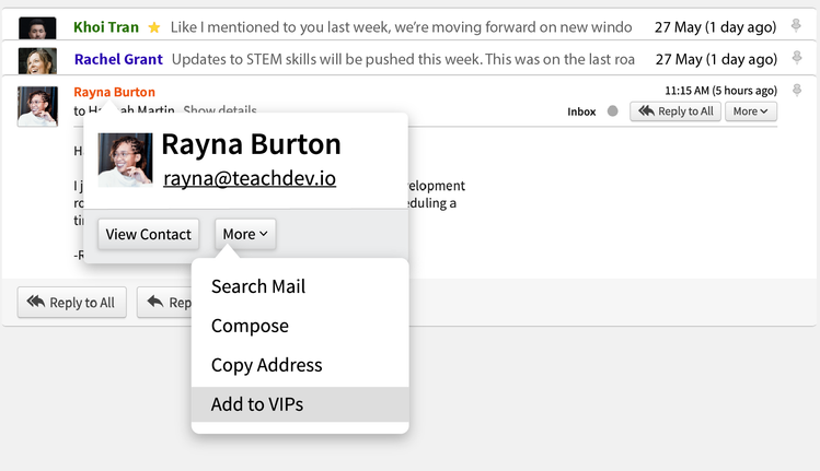 Use the drop-down menu under “More” to choose “Add to VIPs.” Now, this contact will be in your VIP contact list and highlighted with a star in your inbox.