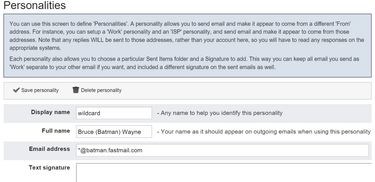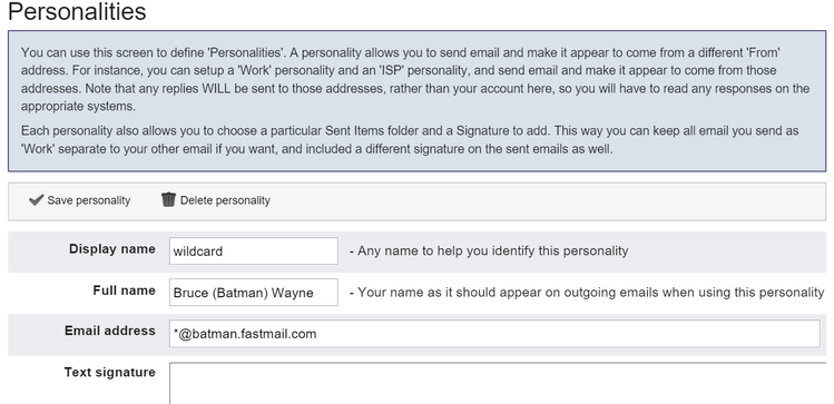 When Batman goes to write an email, he selects the “wildcard” personality which lets him change the ‘from’ address to acme@batman.fastmail.com (or any other subdomain address he needs).