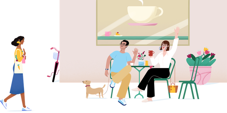 You’ll notice that our illustrated characters are not obsessed with their devices, but living in the moment. Or if they are on their devices, they are happy. Often they are making in-person connections.
