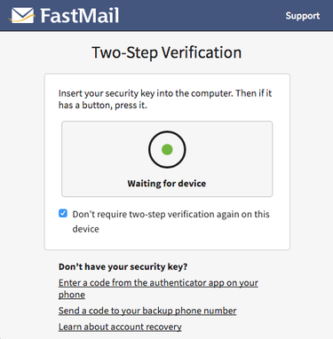 U2F also protects your privacy. Because all the server knows is a random number and a checksum, there’s nothing that identifies the key uniquely. You can use the same U2F device for an account at another website (e.g. Google) and there is no way anyone could know these were the same device, even if they had access to both the Google and FastMail databases.