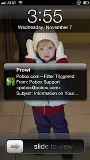We’ve just added a new feature for Pobox Plus and Mailstore accounts, “push notification on filter match”. The push notification sends a short message to your smart phone, that shows the sender and subject of the matching message. Here’s an example of what you’d see: