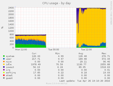 Then I asked the remote hands staff at the datacentre to replace the CPUs, and now we’re getting full use of the IO capacity of the excellent Intel DC-3700 SSDs in these machines.